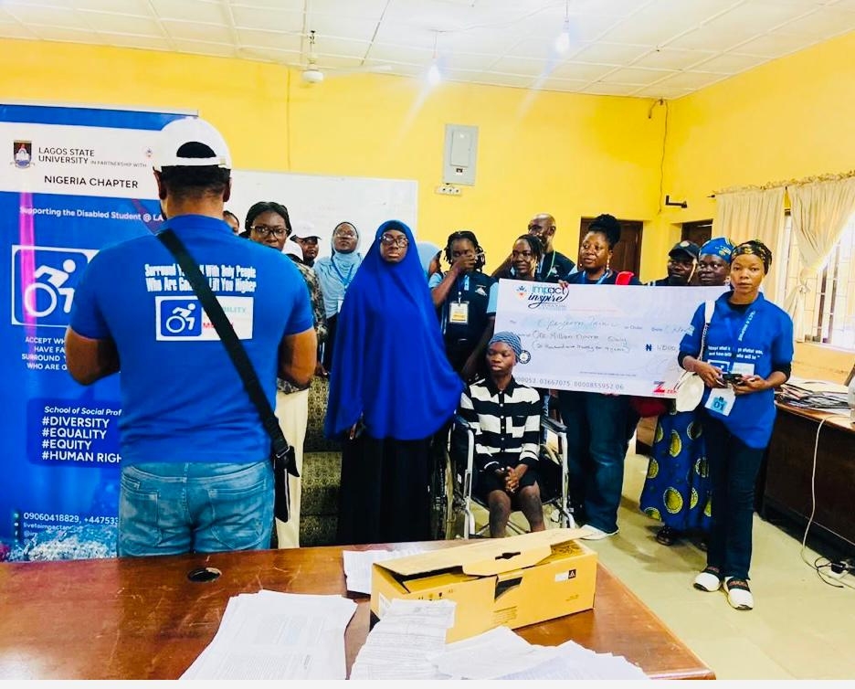 The Impact Inspire Wuraolami Foundation has awarded OpeyemiTaiwo, a physically challenged student at Lagos State University ,LASU, with the sum of one million naira as part of the ImpactInspire Wuraolami Foundation Disabled Student Allowance(IIWFDSA), Promoting DISABILITY PRIDE MONTH!!In addition to the cash prize, Opeyemi Taiwo was also given a laptop, mattress, pillow, bed sheets, bucket, school bag, table,limb foodstuffs, beverages, and a monthly allowance of N20,000,alongside other groceries.